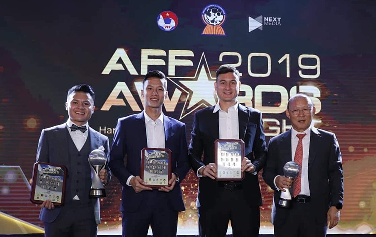 HLV Park (phải) cùng các học trò trong lễ nhận giải AFF Awards hôm qua. Ảnh: Lâm Thoả.