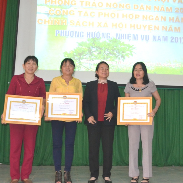Bà Nguyễn Thị Khuyên - Phó chủ tịch Hội Nông dân tỉnh trao bằng khen của TW Hội Nông dân Việt Nam cho 1 tập thể và 2 cá nhân.