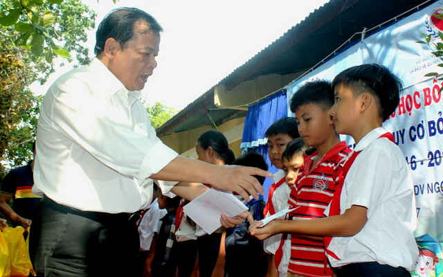 Trong học kỳ II năm học 2016-2017 này, Hội Bảo trợ Quyền trẻ em Việt Nam trao học bổng cho 100 học sinh có nguy cơ bỏ học tại 2 xã Long Chữ và Long Giang của huyện Bến Cầu, trong đó mỗi xã có 20 học sinh khối tiểu học và 30 học sinh khối THCS. Mỗi suất học bổng cho học sinh tiểu học là 350.000 đồng, học sinh THCS là 500.000 đồng. Ngoài ra, kèm theo mỗi suất học bổng là một phần quà tặng trị giá 110.000 đồng. Tổng kinh phí trao học bổng và quà lần này là 55 triệu đồng, do Công ty Cổ phần sản xuất-thương mại-dịch vụ Ngọc Tùng (TP.HCM) tài trợ. Được biết, trong các năm học 2012-2013, 2013-2014, Hội Bảo trợ Quyền trẻ em Việt Nam Cơ quan thường trực phía Nam phối hợp Công ty Johnson & Johnson trao tặng 1.040 suất học bổng “Bảo vệ trẻ em có nguy cơ bỏ học” ở 8 tỉnh, thành phía Nam, trong đó có Tây Ninh. Từ năm học 2015-2016 đến nay, Hội phối hợp Công ty Ngọc Tùng trao tặng 800 suất học bổng và quà tặng cho học sinh tại các tỉnh Tây Ninh, Long An, Bến Tre và Trà Vinh. Quang Son