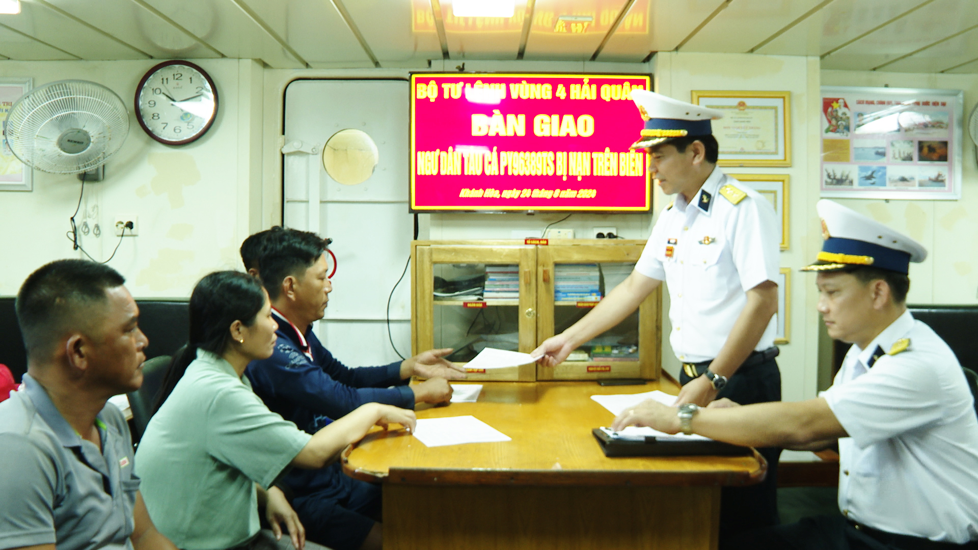Ngày 24.8, tại TP. Cam Ranh, tỉnh Khánh Hoà, tàu 475 Bộ Tư lệnh Vùng 4 Hải quân đã tiến hành bàn giao 5 ngư dân gặp nạn trên tàu cá PY 96389 TS cho gia đình và chính quyền địa phương.