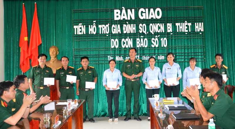 Có 10 sĩ quan, quân nhân chuyên nghiệp được Bộ Tư lệnh Quân khu 7 hỗ trợ gia đình bị thiệt hại do bão số 10 với tổng số tiền 23 triệu đồng. Trong đó, tùy mức độ thiệt hại, mỗi sĩ quan, quân nhân chuyên nghiệp được hỗ trợ từ 1-3 triệu đồng.