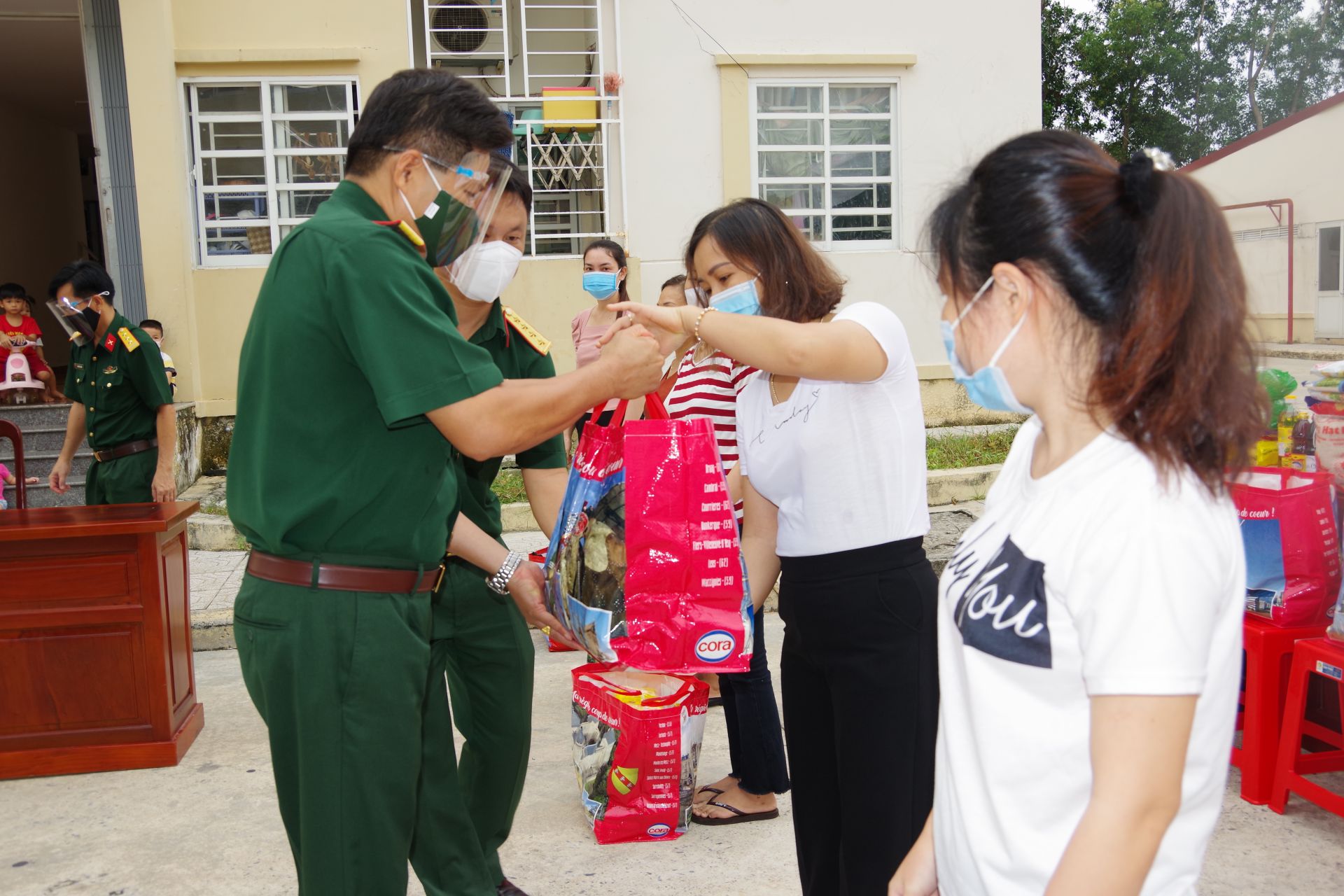 Đại tá Phạm Anh Tuấn, Bí thư Đảng ủy, Chính ủy Sư đoàn, tặng quà cho gia đình quân nhân có hoàn cảnh khó khăn trong đại dịch Covid-19.