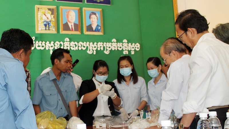 Các cán bộ của Chi cục Vệ sinh an toàn thực phẩm Tây Ninh hướng dẫn cách sử dụng test nhanh, kỹ thuật lấy mẫu thực phẩm phục vụ công tác vệ sinh an toàn thực phẩm cho các nhân viên Trung tâm Y tế Thành phố Suong, tỉnh Tboung Khmum. Phía ngành Y tế Tây Ninh cũng đã trao tặng 5 bộ test nhanh an toàn vệ sinh thực phẩm và 3 chiếc đèn tia cực tím thử tynopal cho ngành Y tế tỉnh Tboung Khum.