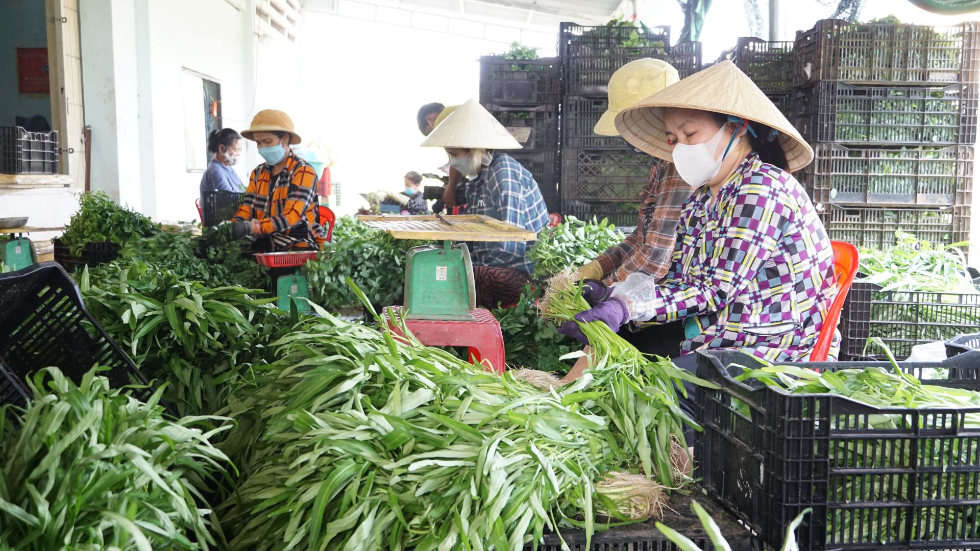 Sơ chế rau ăn lá tại HTX dịch vụ nông nghiệp Phước Ninh (huyện Dương Minh Châu).