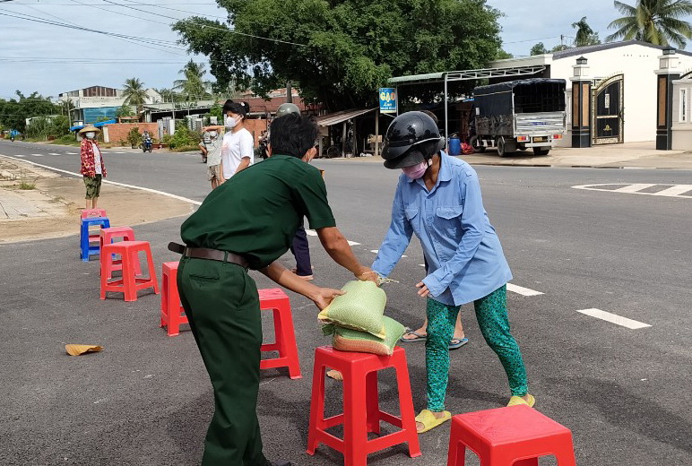 Cán bộ, chiến sĩ Ban CHQS huyện Gò Dầu phát gạo cho người dân khó khăn.