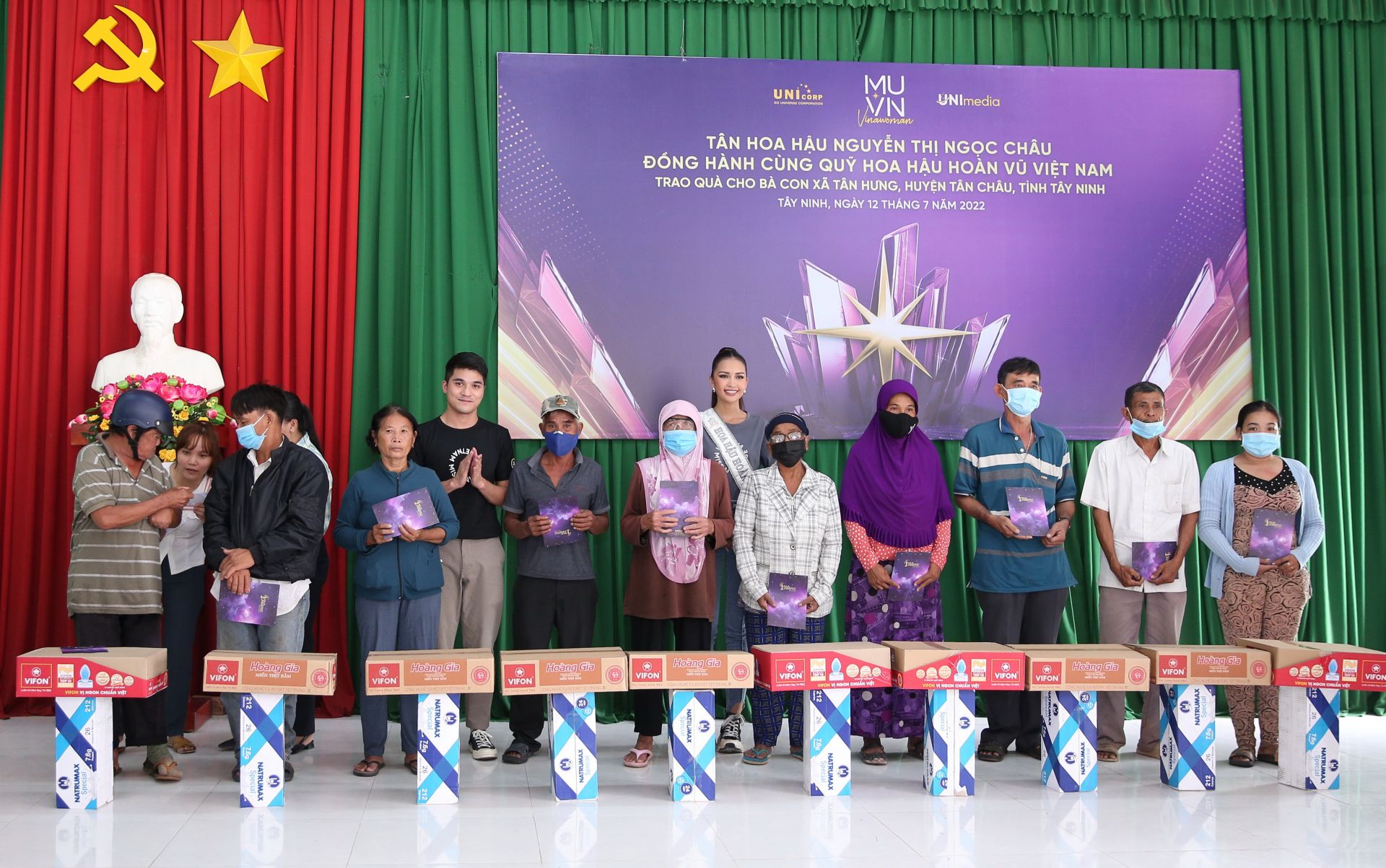 Đại diện BTC cuộc thi Hoa hậu Hoàn vũ 2022 và Hoa hậu Ngọc Châu trao tặng quà cho người dân xã Tân Hưng.