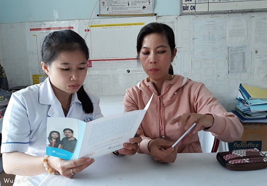 Cán bộ DS-KHHGĐ xã Long Thành Bắc (bìa trái) tư vấn biện pháp tránh thai cho khách hàng.