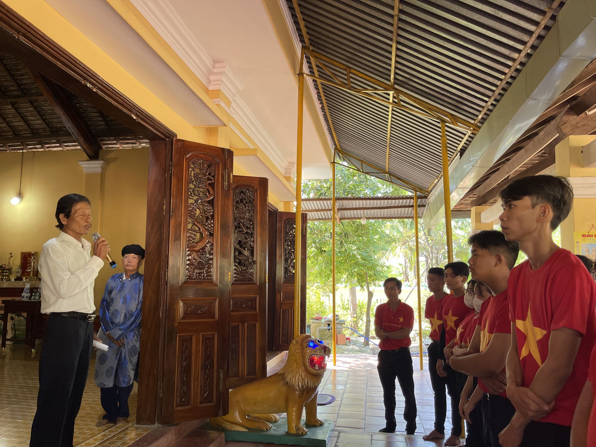 Đoàn viên, thanh niên nghe thuyết minh tại đình Long Thành.