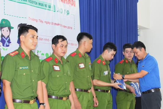Phó Bí thư Tỉnh đoàn Tây Ninh Nguyễn Tiến Tân tặng nón và áo tình nguyện cho các chiến sĩ Mùa hè xanh.