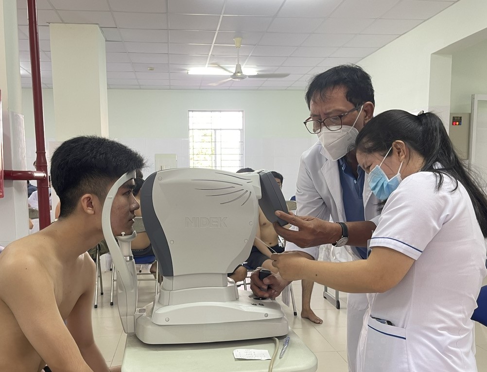 Bác sĩ Trung tâm y tế thị xã Hoà Thành khám mắt cho nam công dân trong độ tuổi nhập ngũ.