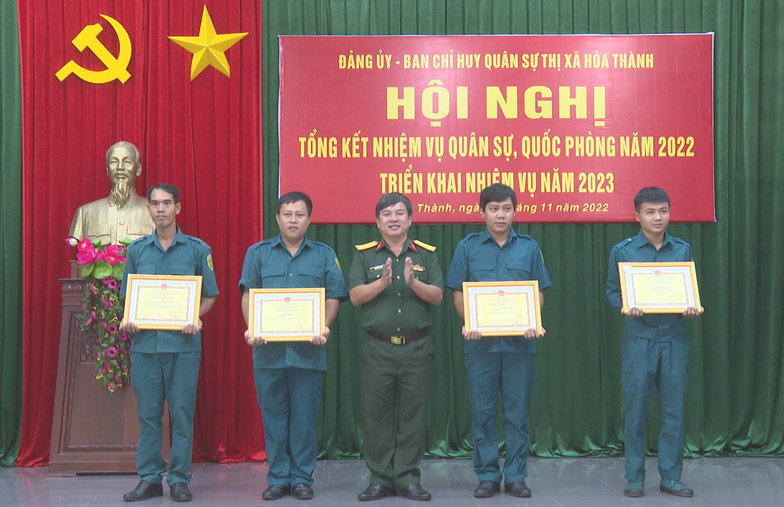 Thượng tá Nguyễn Minh Tấn- Chỉ huy trưởng Ban CHQS thị xã Hòa Thành trao giấy khen cho các tập thể.