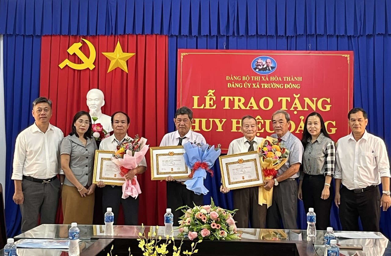 Trong đó, Huy hiệu 55 năm tuổi Đảng được trao cho đảng viên Tống Văn Mai (sinh năm 1945) sinh hoạt tại Chi bộ ấp Trường Ân; Huy hiệu 40 năm tuổi Đảng được trao cho đảng viên Trần Văn Tẻo (sinh năm 1957) sinh hoạt tại Chi bộ ấp Trường Phú và Huy hiệu 30 năm tuổi Đảng được trao cho đảng viên Trần Quốc Tuấn (sinh năm 1966) sinh hoạt tại Chi bộ ấp Trường Đức.