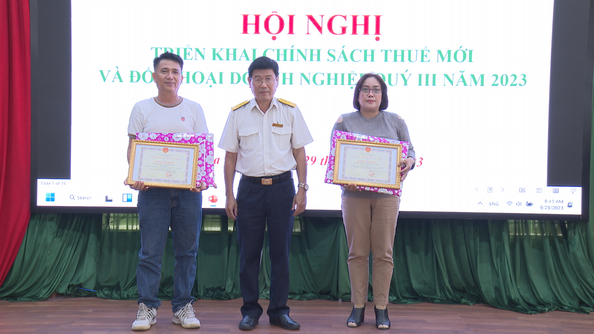 Chi cục trưởng Chi cục Thuế khu vực Hoà Thành - Dương Minh Châu Phan Xuân Vinh trao giấy khen cho 2 doanh nghiệp.