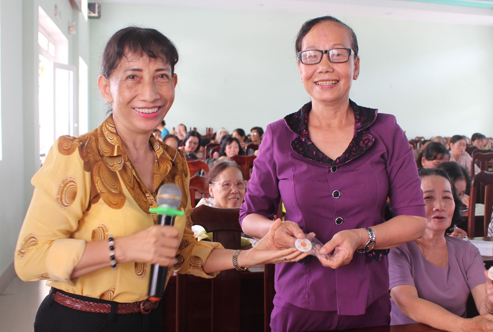 Tặng quà cho phụ nữ tham gia trả lời câu hỏi về xây dựng nông thôn mới.