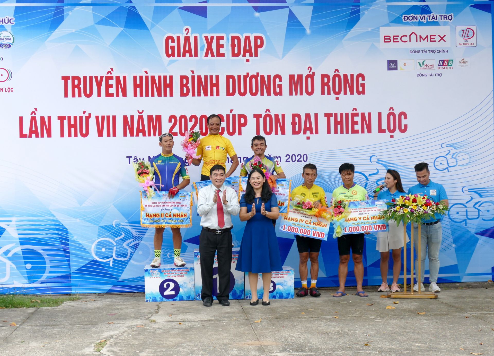 TBT Báo Tây Ninh Trần Thị Mỹ Linh và Giám đốc Đài PTTH Bình Dương trao thưởng cho các tay đua về đích đầu tiên ở nhóm tuổi từ 16 đến 40.
