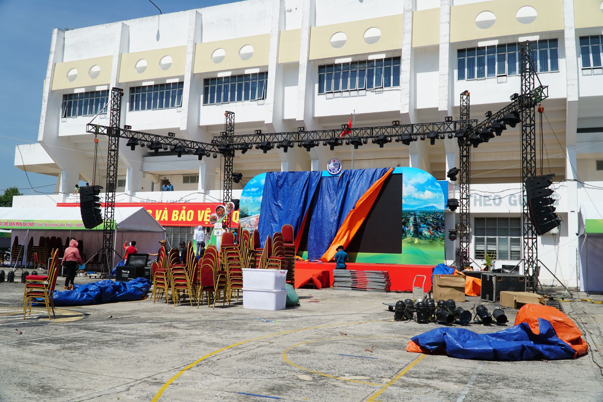 Sân khấu đã lắp đặt xong màn hình led, hệ thống đèn màu, âm thanh.