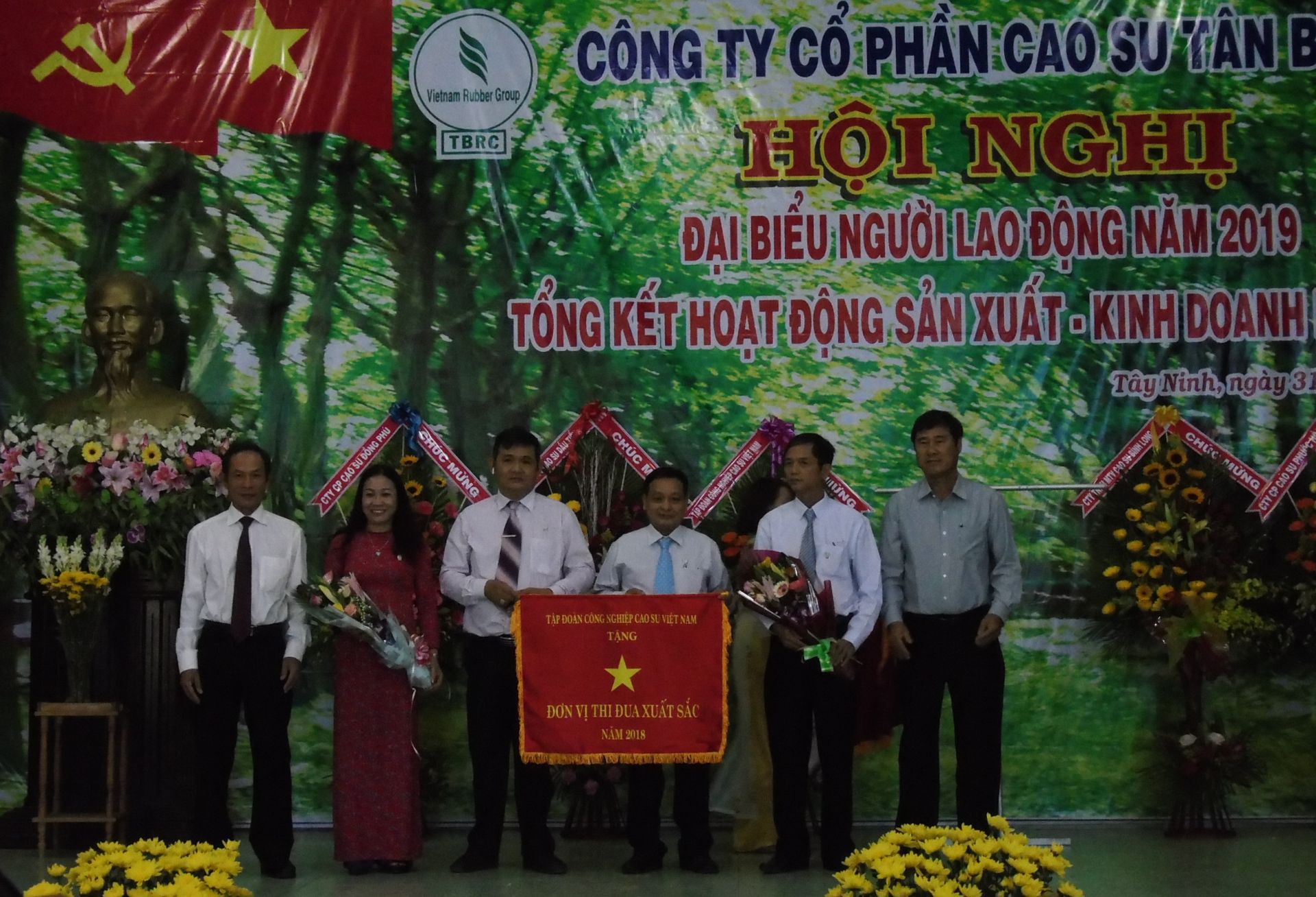 Lãnh đạo Công ty cổ phần cao su Tân Biên nhận cờ đơn vị thi đua xuất sắc năm 2018 do Tập đoàn công nghiệp cao su Việt Nam tặng.