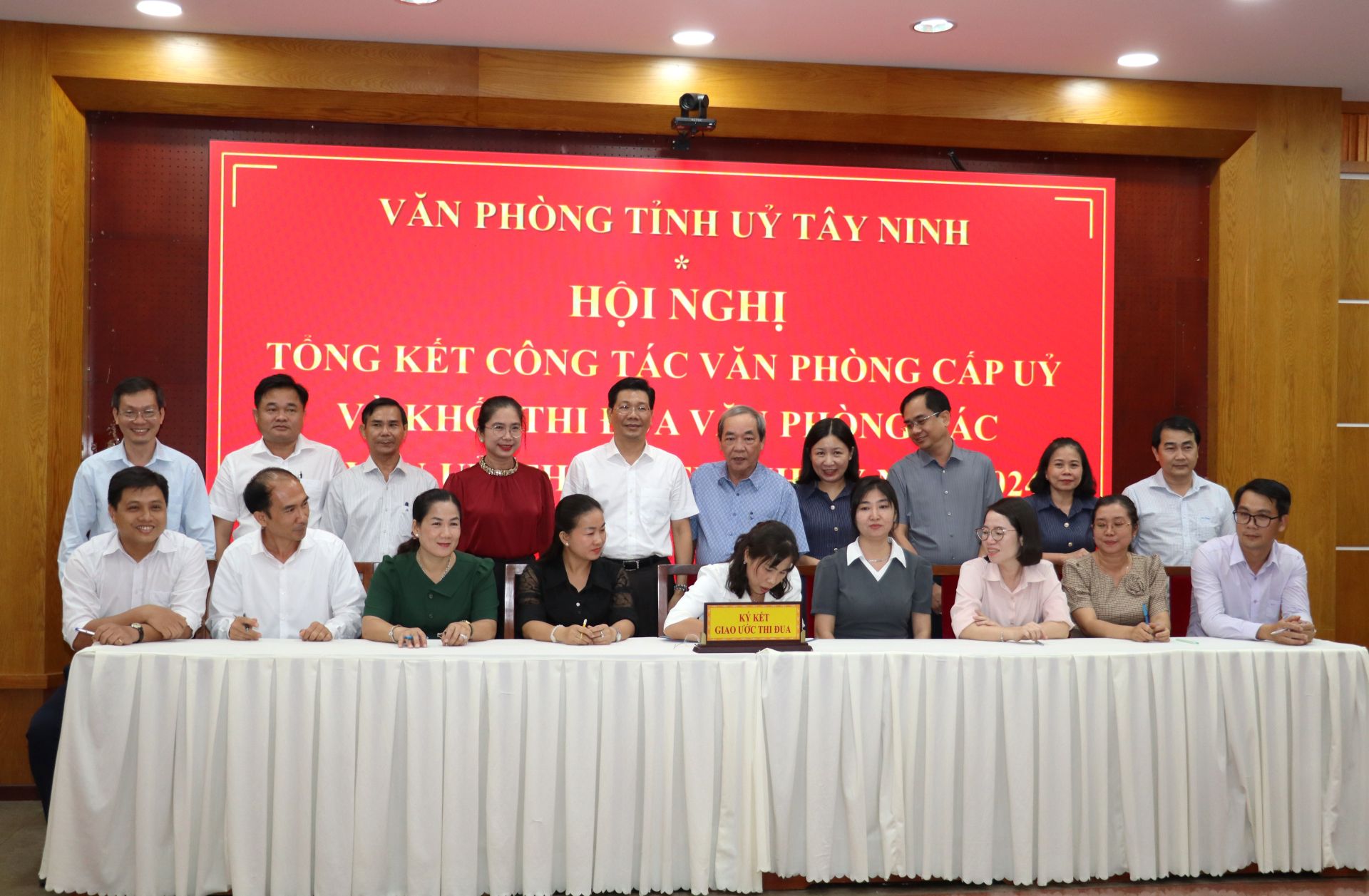 Dịp này, UBND tỉnh và Văn phòng Tỉnh uỷ biểu dương, khen thưởng các đơn vị tiêu biểu năm 2024 đã có thành tích xuất sắc trong thực hiện phong trào thi đua. Các đơn vị trong khối thi đua văn phòng các huyện uỷ, thị uỷ, thành uỷ ký kết thi đua, quyết tâm thực hiện các nhiệm vụ và mục tiêu đã đề ra trong năm 2025.