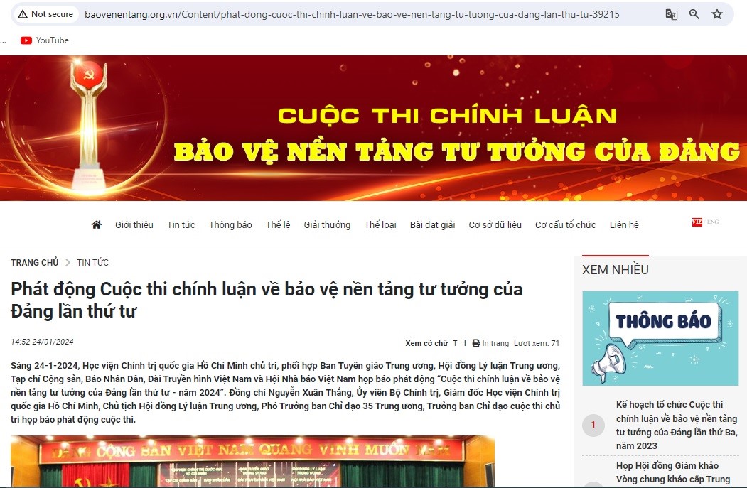 Vừa qua, Học viện Chính trị quốc gia Hồ Chí Minh chủ trì, phối hợp với Ban Tuyên giáo Trung ương và các bộ, ngành liên quan tổ chức phát động Cuộc thi chính luận Bảo vệ nền tảng tư tưởng của Đảng lần thứ 4, năm 2024.