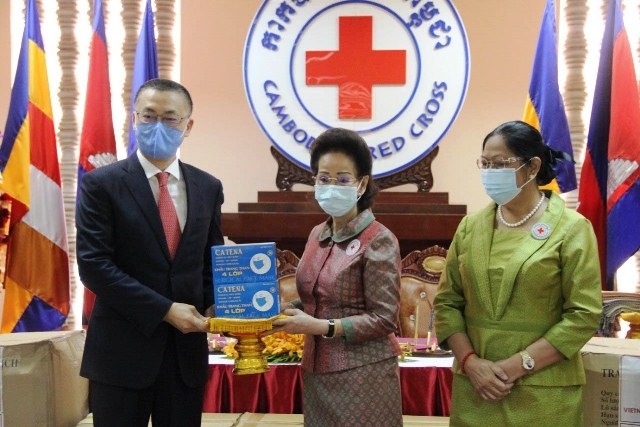 Tại đây, Đại sứ đặc mệnh toàn quyền nước CHXHCN Việt Nam tại Vương quốc Campuchia Vũ Quang Minh, đại diện Hội Chữ thập đỏ Việt Nam, đã trao quà tặng gồm 60 nghìn khẩu trang y tế và 300 bộ quần áo bảo hộ y tế cho đại diện Hội Chữ thập đỏ nước bạn.