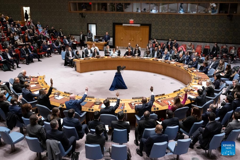 Đại diện các nước bỏ phiếu về dự thảo nghị quyết trong cuộc họp của Hội đồng Bảo an Liên hợp quốc, ngày 20/2/2024. (Ảnh: Xinhua)