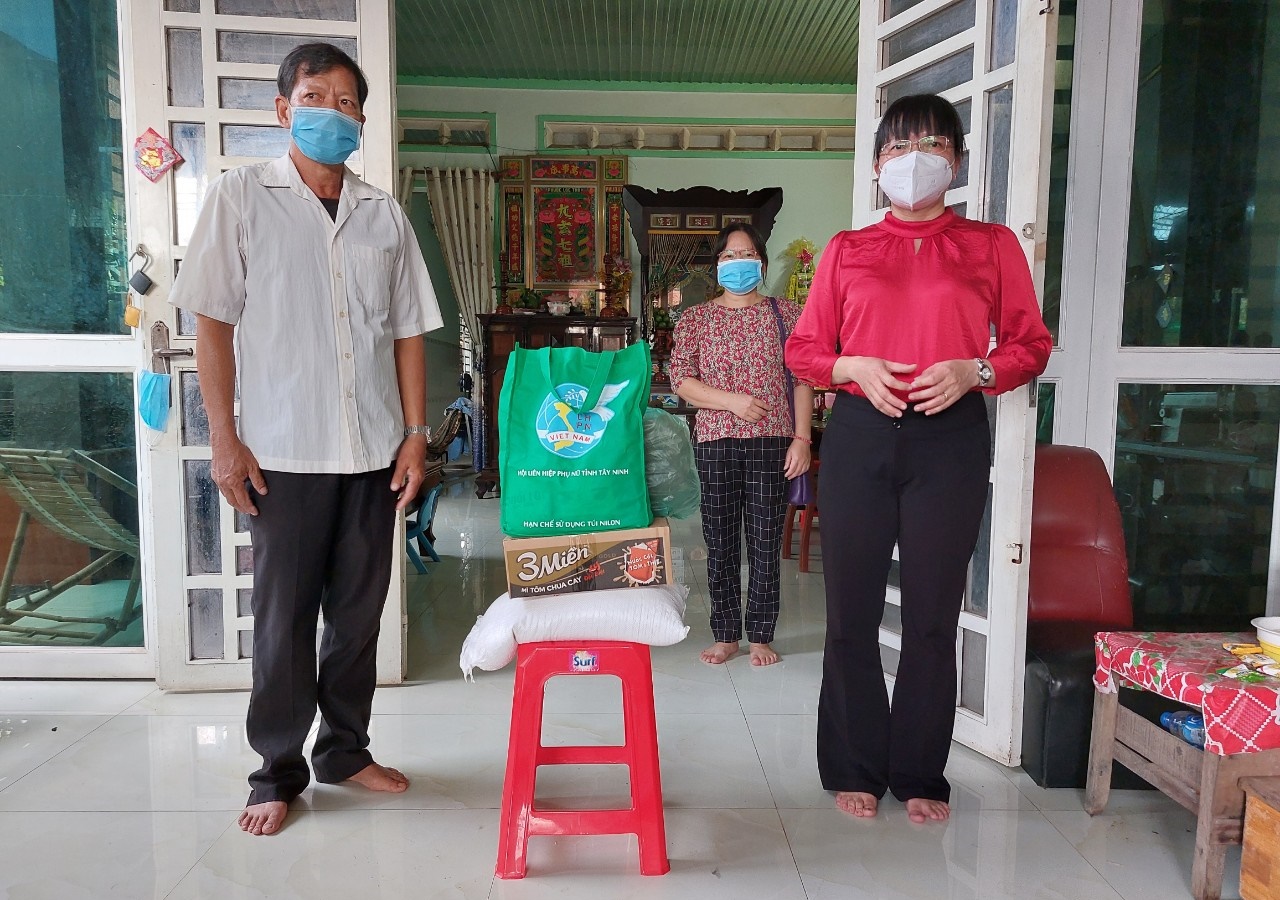 Bà Võ Thị Hạnh, Chủ tịch Hội LHPN thị xã Hoà Thành tặng quà cho hộ gia đình có người thân mất do Covid-19.