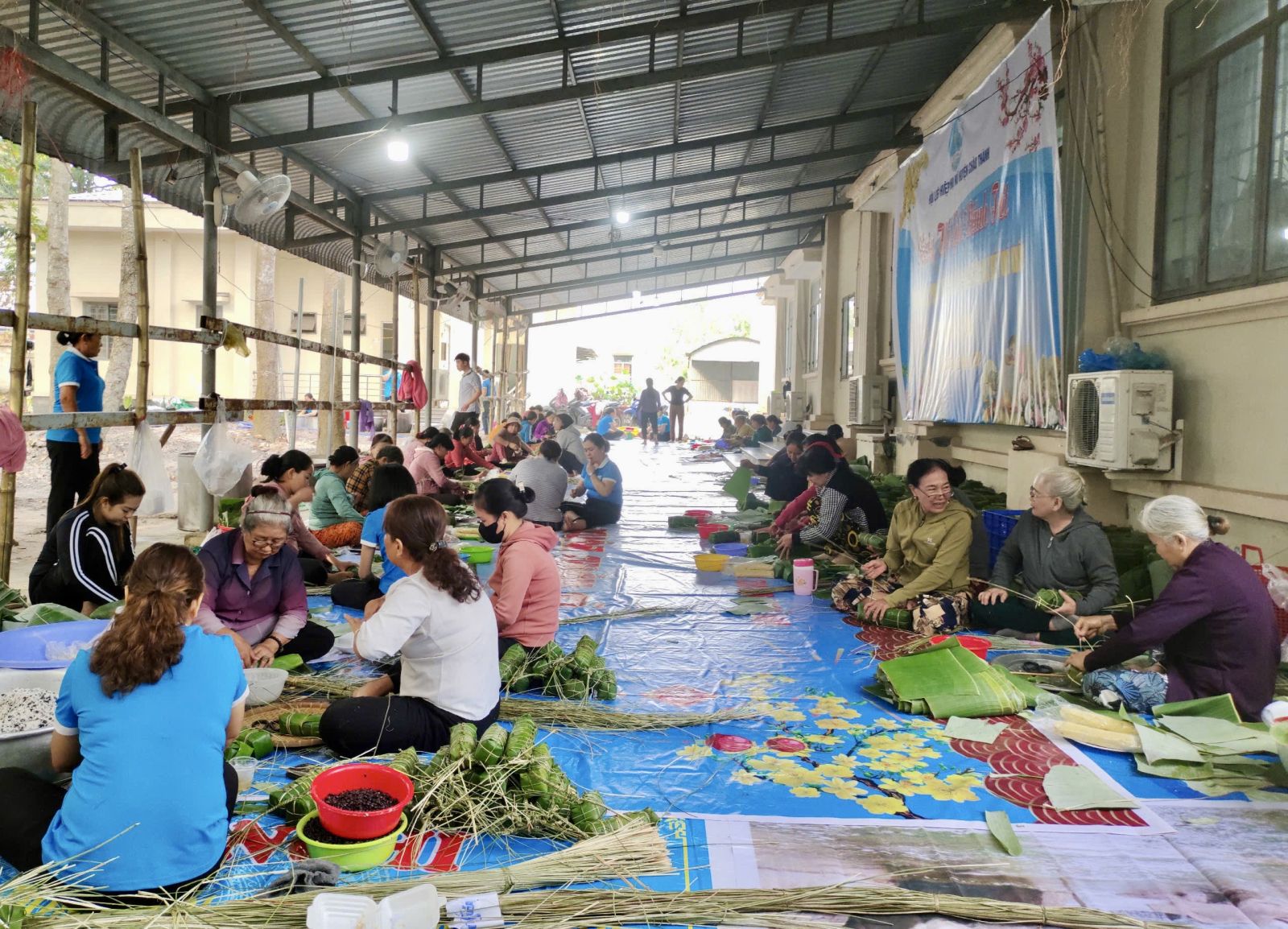 Ngay từ sáng sớm, đông đảo hội viên phụ nữ trên địa bàn huyện cùng nhau chuẩn bị các nguyên liệu từ gạo nếp, lá chuối, thịt heo đã sơ chế, đậu xanh… để gói những đòn bánh tét thắm đượm nghĩa tình. Bằng sự khéo léo, tỉ mỉ, các dì, các cô và chị em phụ nữ đã tạo nên những đòn bánh không chỉ đẹp mắt mà còn bảo đảm về tiêu chuẩn.
