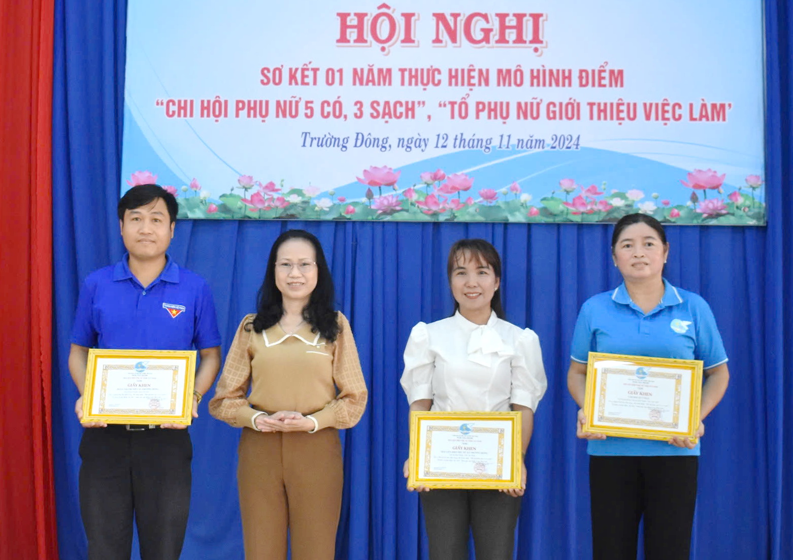 Dịp này Hội LHPN tỉnh tặng giấy khen cho 3 tập thể và 5 cá nhân có thành tích tiêu biểu trong triển khai, thực hiện mô hình. Hội LHPN xã Trường Đông trao 60 phần quà cho hộ gia đình hộ nghèo, hộ cận nghèo, người bán vé số có hoàn cảnh khó khăn trên địa bàn xã với tổng trị giá 24 triệu đồng.