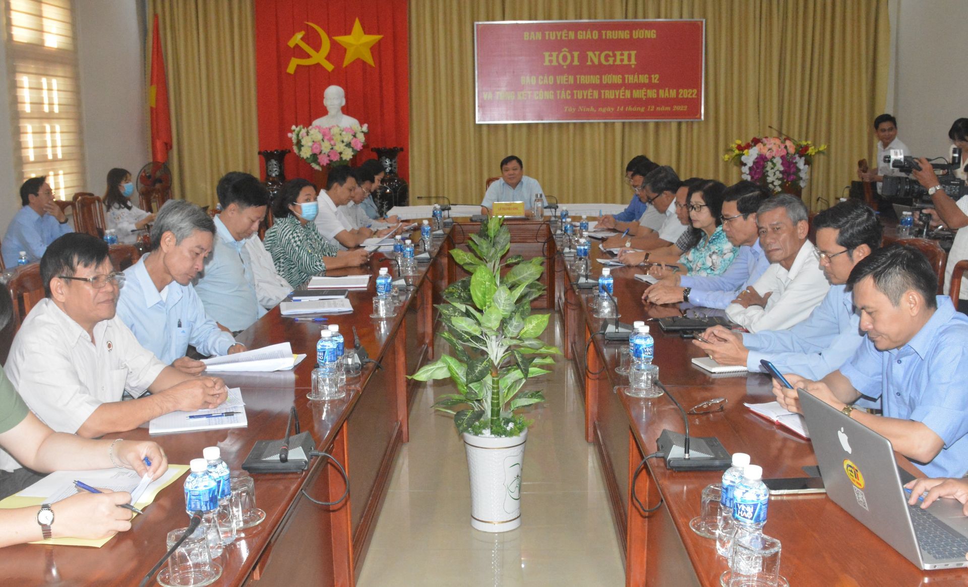 Tham dự tại điểm cầu Tây Ninh có ông Lê Thành Công- Phó trưởng Ban Thường trực Ban Tuyên giáo Tỉnh uỷ, đại diện các sở, ban, ngành liên quan. Các đại biểu tham dự hội nghị nghe lãnh đạo Bộ Kế hoạch và Đầu tư trình bày tình hình kinh tế, xã hội năm 2022, kế hoạch phát triển kinh tế xã hội năm 2023.