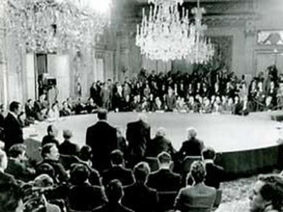 Bàn đàm phán Hiệp định Paris năm 1973 tại Paris - Pháp (Nguồn: TTXVN)