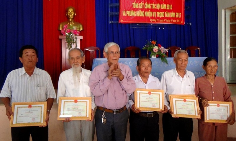 Ông Lê Trung Dũng – Chủ tịch Hội Người tù kháng chiến Thành phố khen thưởng cho các hội viên tiêu biểu năm 2016. |