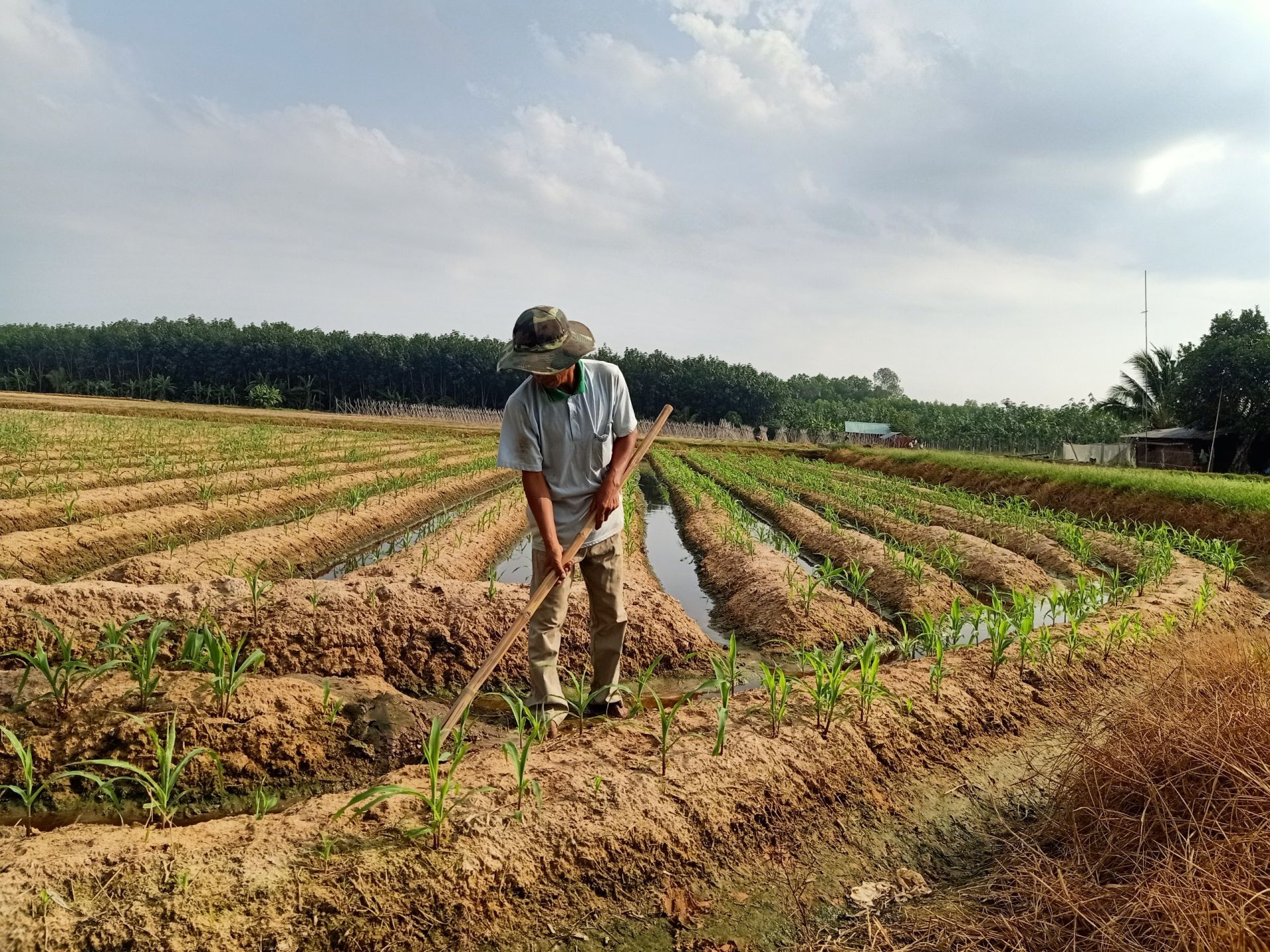 Ông Đơn chăm sóc ruộng bắp của gia đình.