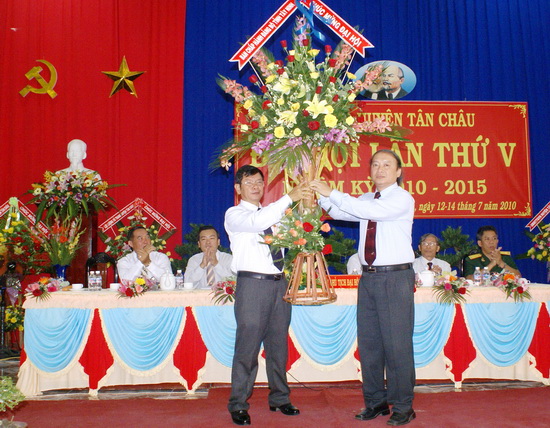 Ông Võ Văn Phuông- Ủy viên BCH Trung ương Đảng, Phó Trưởng Ban Thường trực Ban Tuyên giáo Trung ương, nguyên Bí thư Tỉnh ủy Tây Ninh (phải) trao lẵng hoa cho ông Nguyễn Xuân Hồng- Phó Bí thư Huyện uỷ tại Đại hội đại biểu Đảng bộ huyện Tân Châu lần thứ V, nhiệm kỳ 2010 - 2015. Ảnh: Đ.H.T