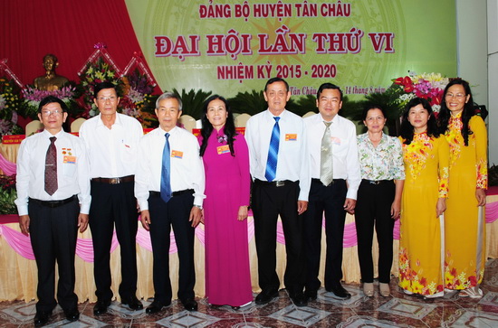 Ông Nguyễn Xuân Hồng và các vị đại biểu nguyên lãnh đạo huyện qua các thời kỳ tại Đại hội đại biểu Đảng bộ huyện Tân Châu lần thứ VI, nhiệm kỳ 2015 - 2020. Ảnh: Công Điều.