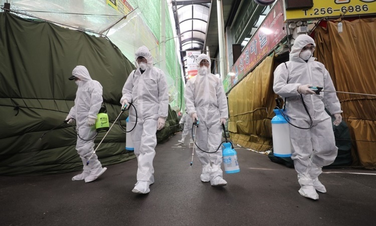 Nhân viên y tế tẩy trùng một khu chợ ở Daegu ngày 23/2. Ảnh: AFP.