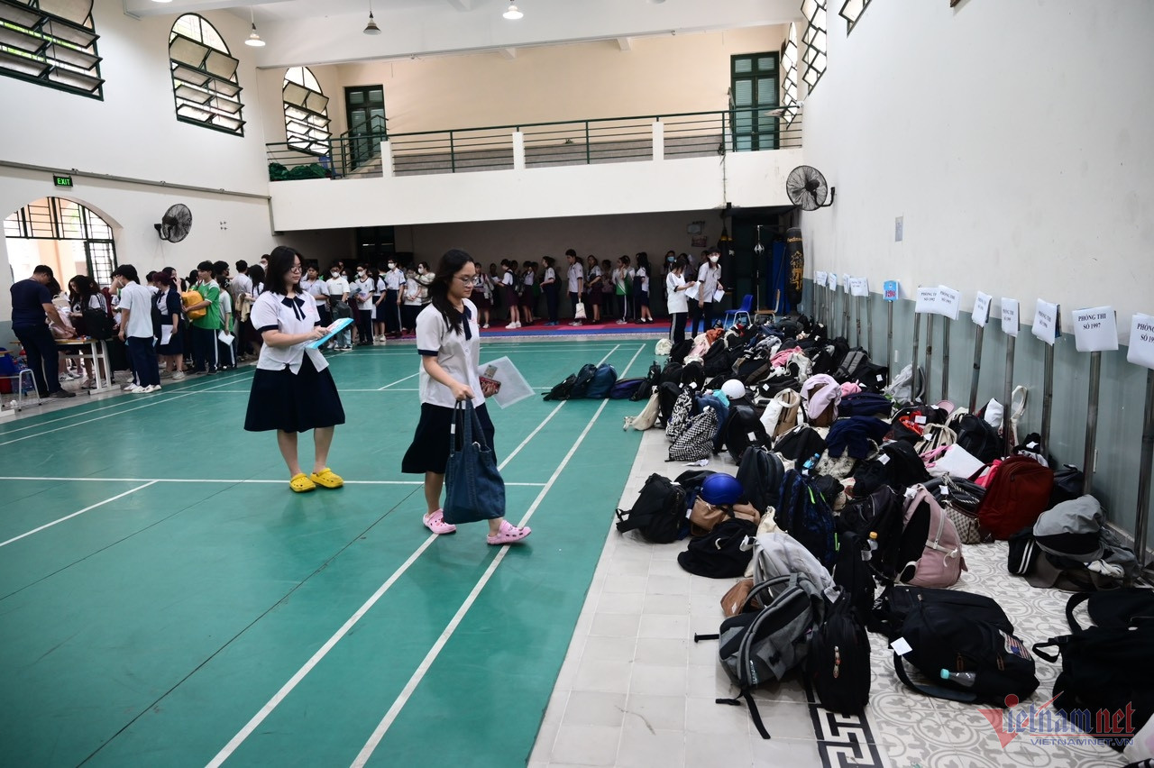 Các thí sinh được hướng dẫn xếp hàng gửi đồ tại khu vực cách các phòng thi 50m. Ảnh: Nguyễn Huế
