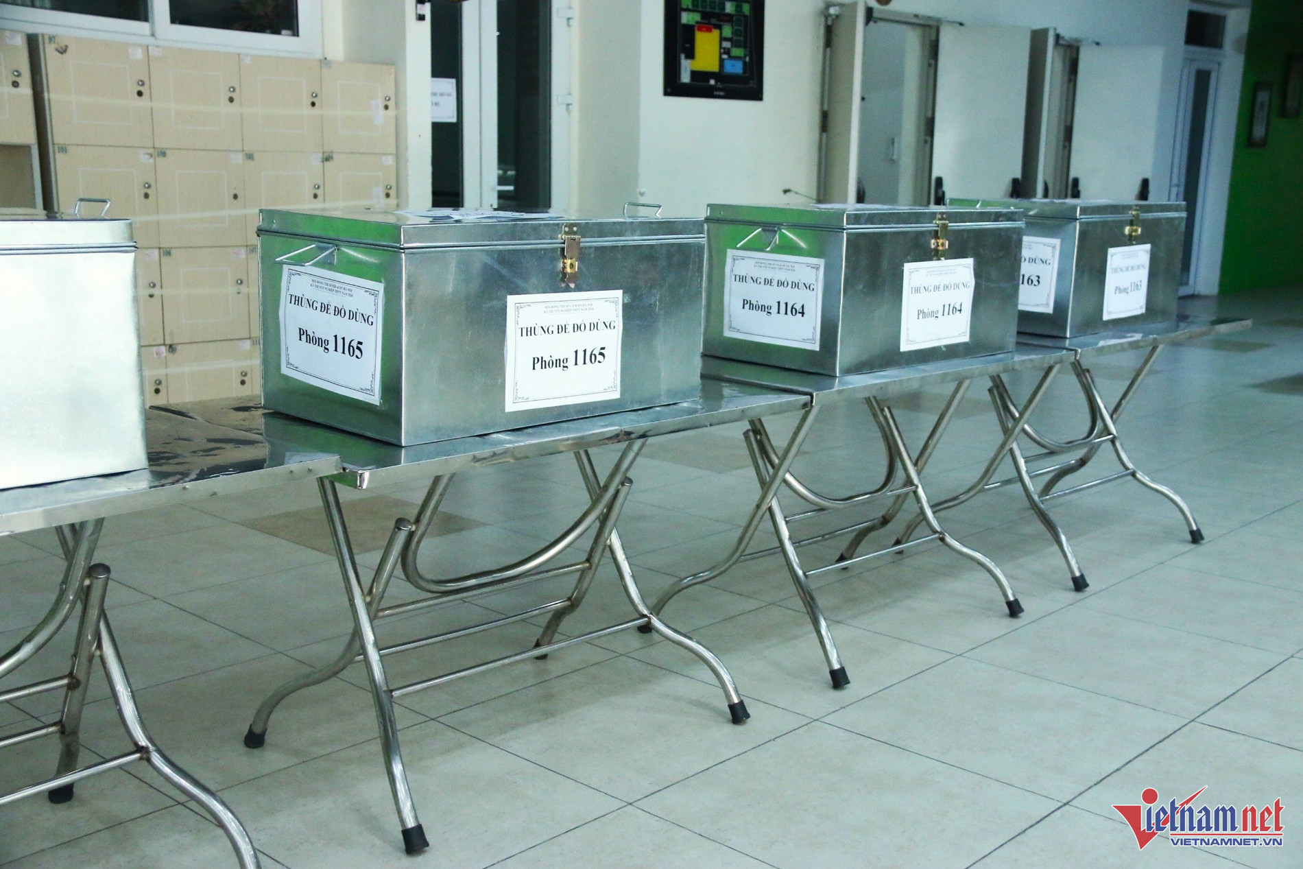 Tại điểm thi Trường THCS Thanh Xuân (Hà Nội), những thùng để đồ dùng, vật dụng cá nhân của thí sinh được bố trí đầy đủ, nghiêm ngắn. Ảnh: Thanh Hùng