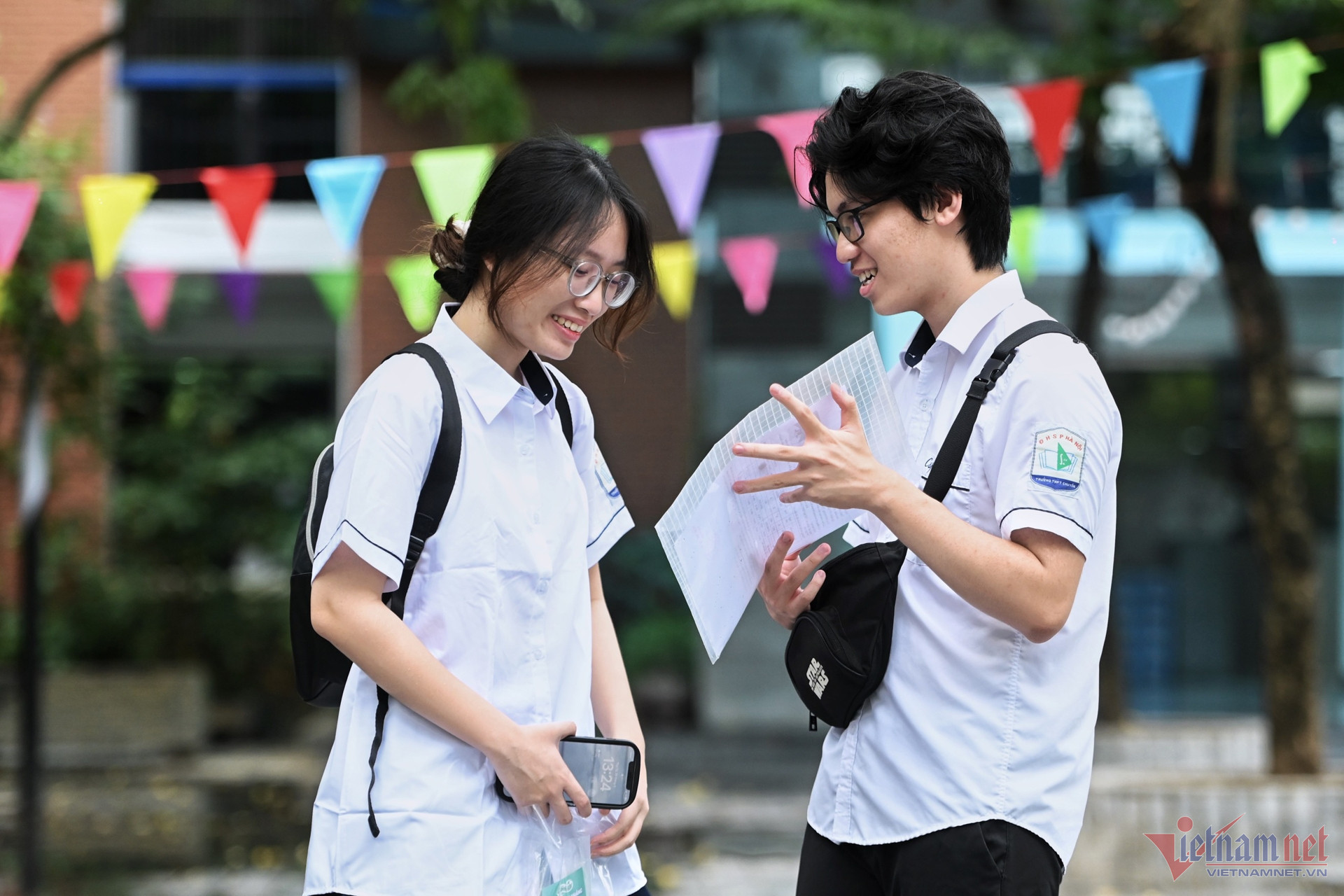 Học sinh Lan Uyên cùng bạn tại điểm thi Trường THCS&THPT Lương Thế Vinh (Hà Nội). Ảnh: Thạch Thảo