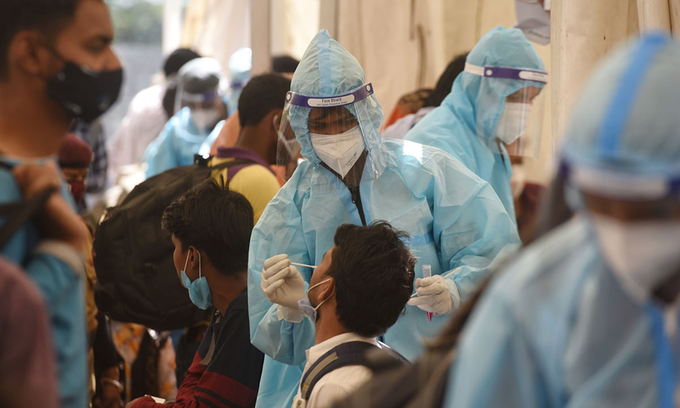 Nhân viên y tế lấy mẫu xét nghiệm Covid-19 tại một bến xe buýt ở New Delhi, Ấn Độ hôm 3/4. Ảnh: Hindustan Times.