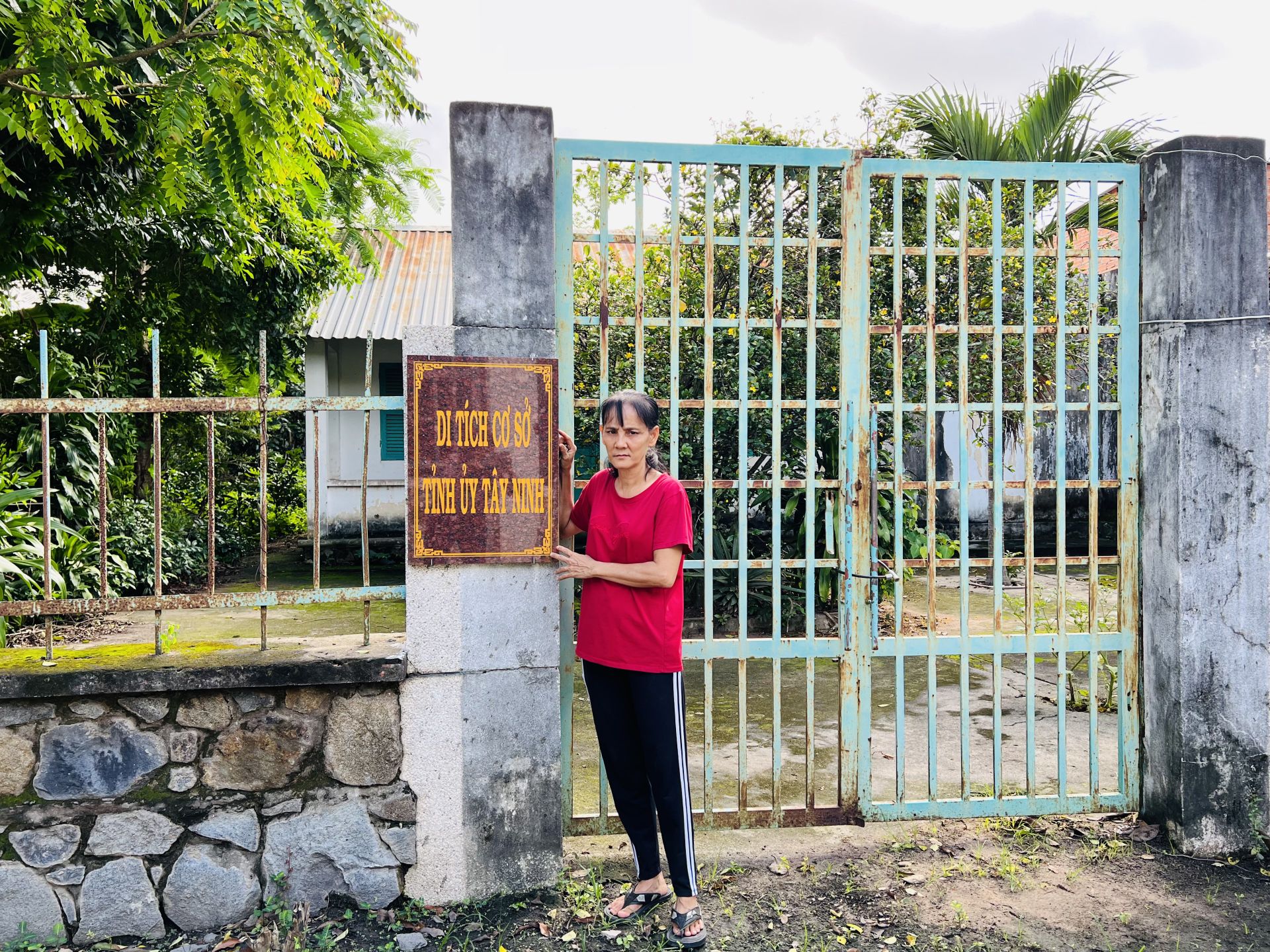 Bà Trần Thị Huệ trước cổng Di tích Cơ sở Tỉnh ủy Tây Ninh.