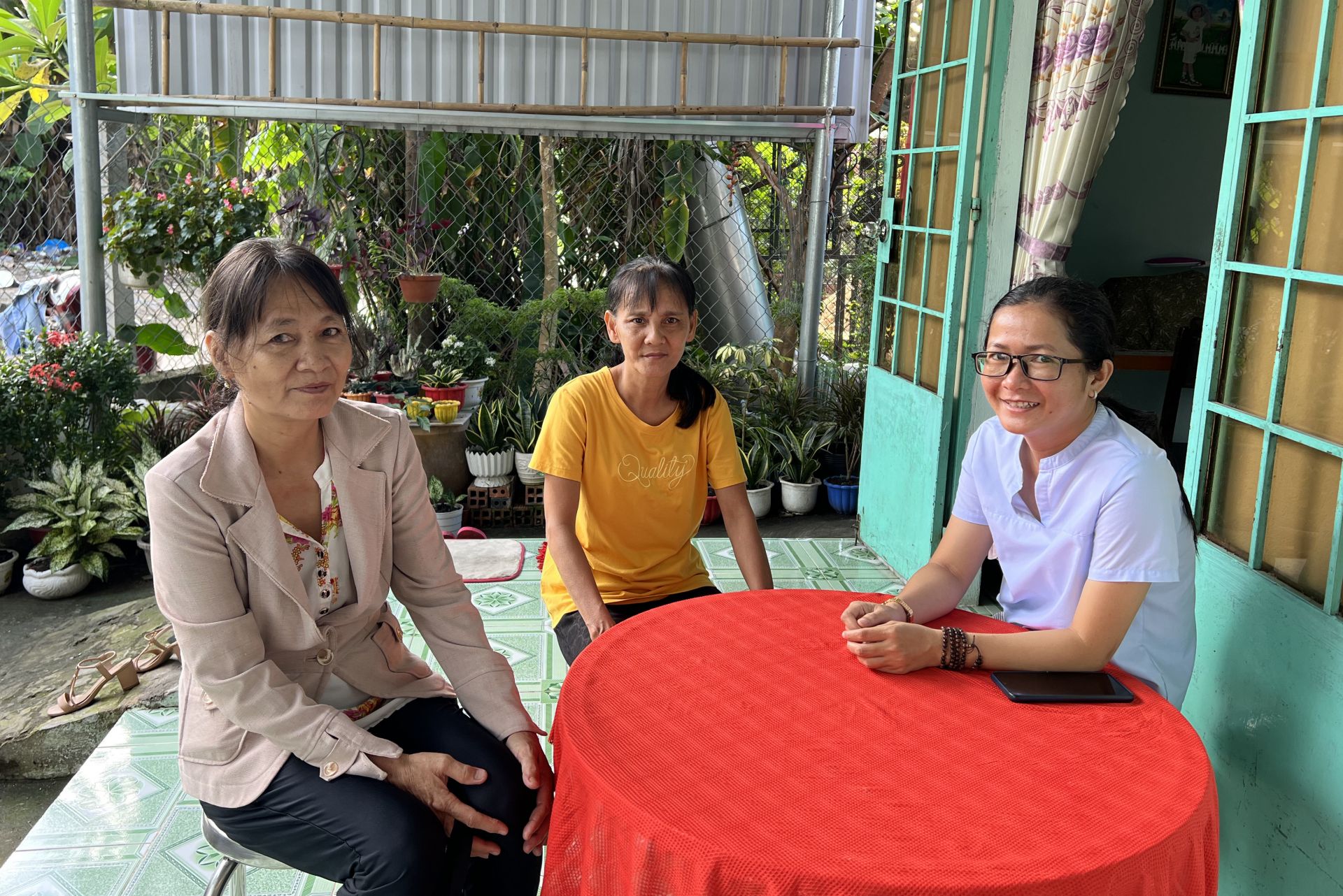 Chị Phan Thị Bích Thảo- Chủ tịch Hội LHPN phường 2 (bìa phải) trao đổi công việc với chị em hội viên tại nhà bà Trần Thị Huệ.