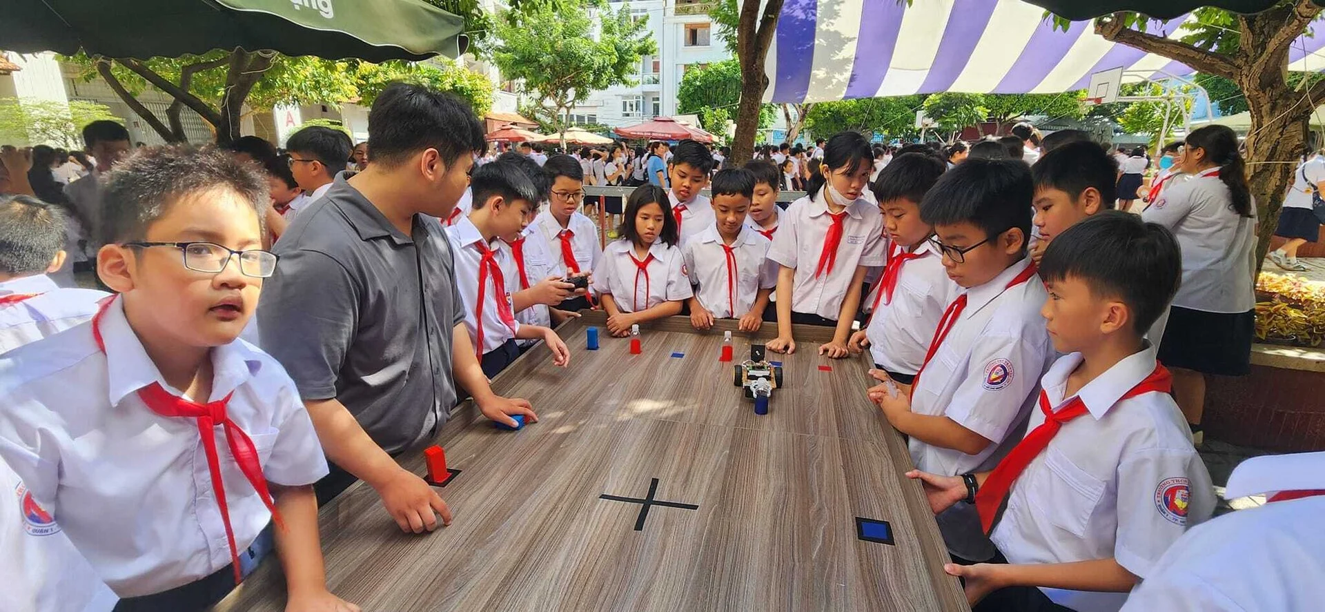 Sau phần Lễ khai giảng ngắn gọn, ý nghĩa, học sinh trường THCS Trần Văn Ơn (Quận 1) được trải nghiệm các gian hàng "học mà chơi - chơi mà học", gồm gian hàng domino Toán học, gian hàng thí nghiệm khoa học vui, trải nghiệm Robotic... Các em vừa chơi, vừa có những phần quà lưu niệm trong ngày khai giảng đầy ý nghĩa.