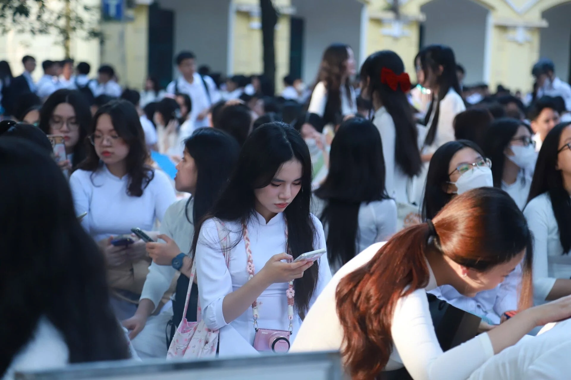 Các nữ sinh trường THPT Chu Văn An (Tây Hồ, Hà Nội) xinh xắn, rạng ngời trong tà áo dài. Để có những bức hình ấn tượng ngày khai giảng, các nữ sinh đã tự tay chuẩn bị những tấm biển hashtag các khẩu hiệu vui tươi.
