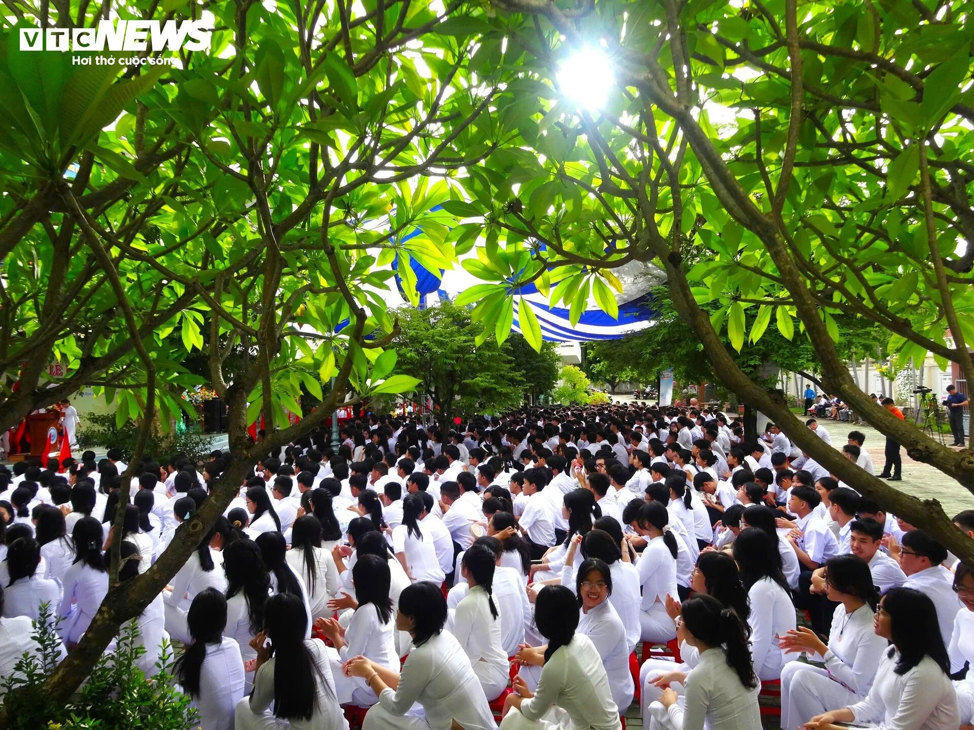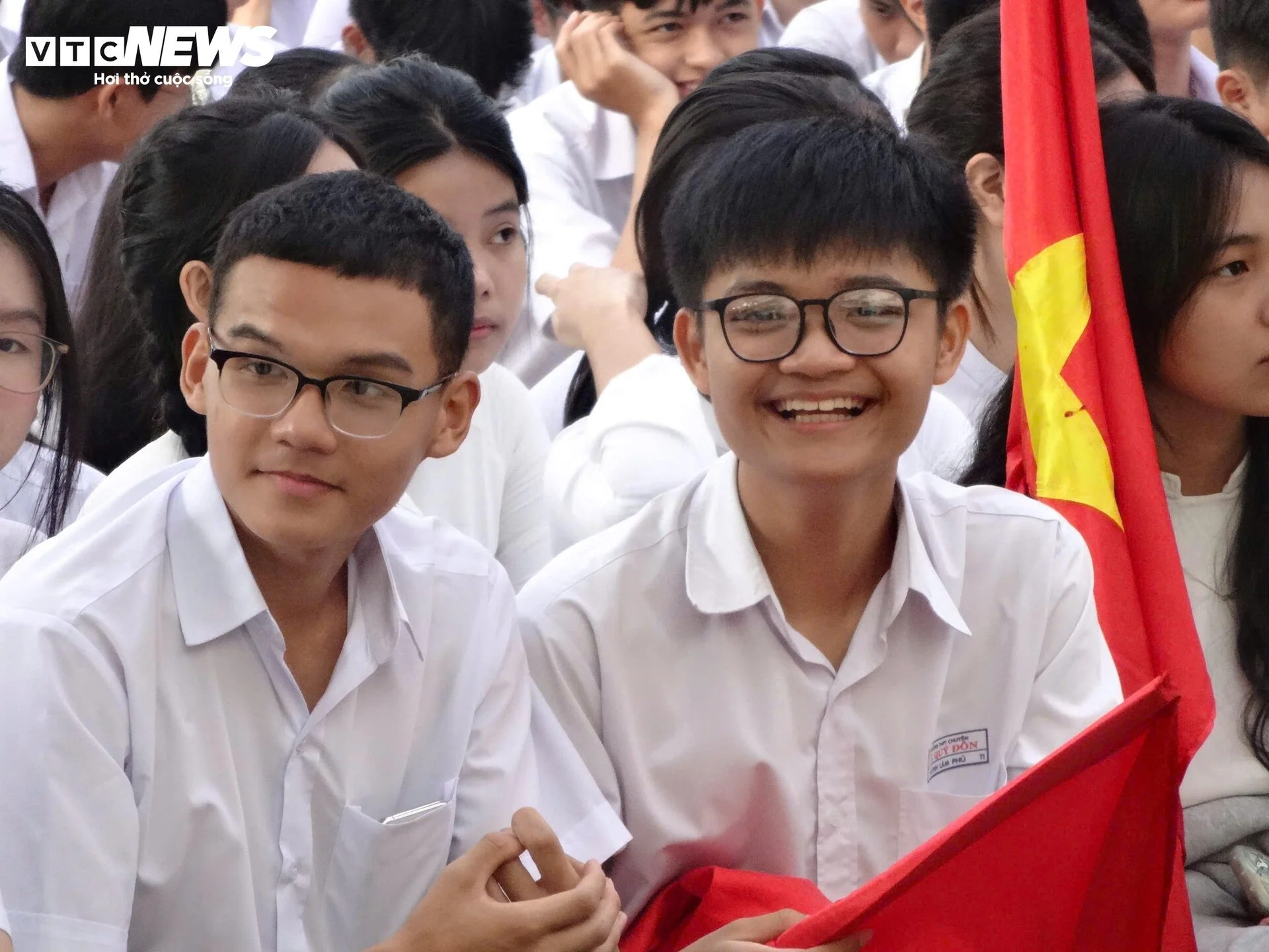 Học sinh khối THPT trên địa bàn tỉnh Bình Định hân hoan trong buổi khai giảng sau những tháng ngày hè xa cách bạn bè, thầy cô. (Ảnh tại Trường THPT Lê Quý Đôn, TP. Quy Nhơn)
