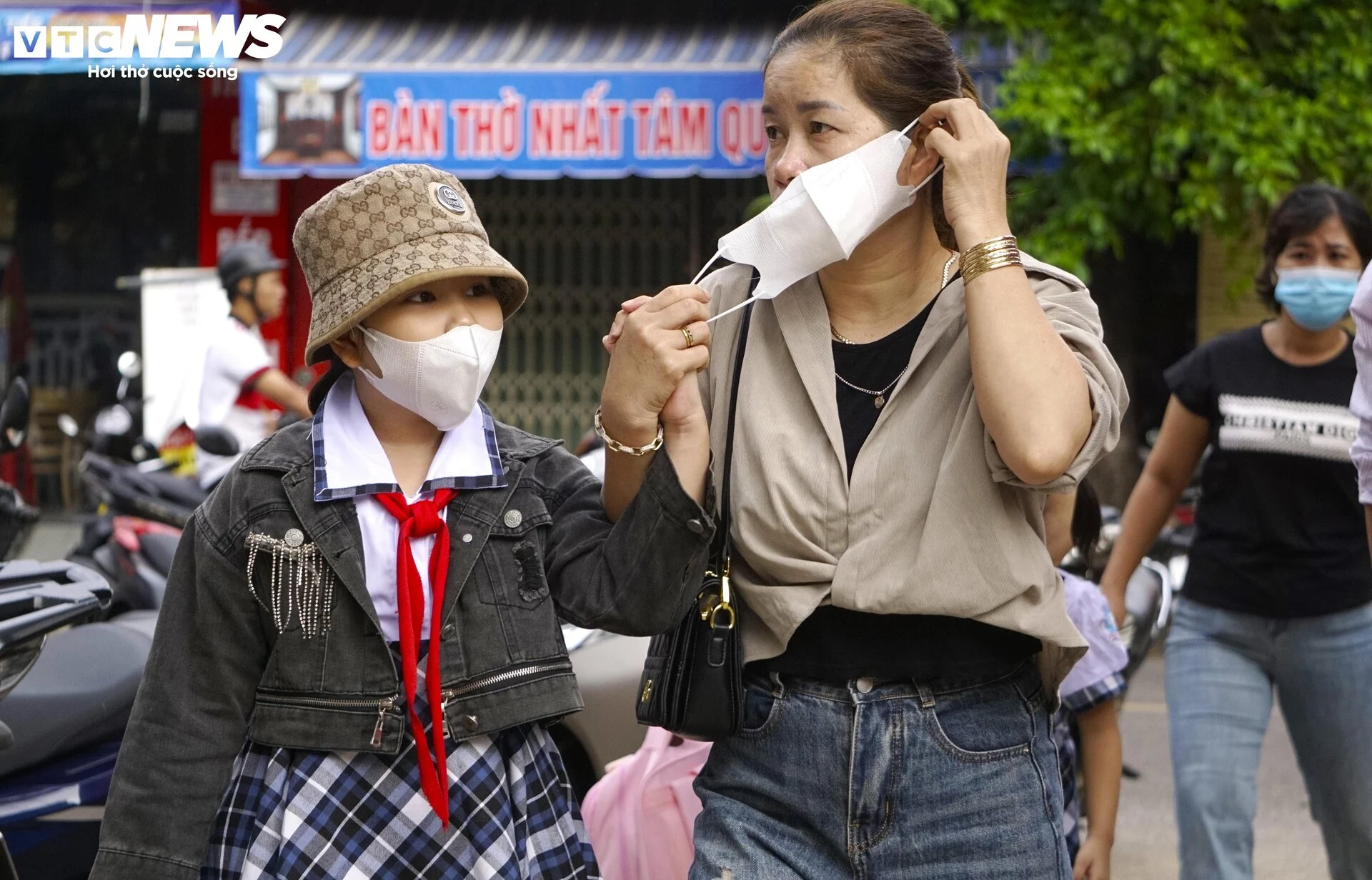 Các em học sinh cấp tiểu học cũng được phụ huynh đưa đến trường trong buổi sáng 5/9.