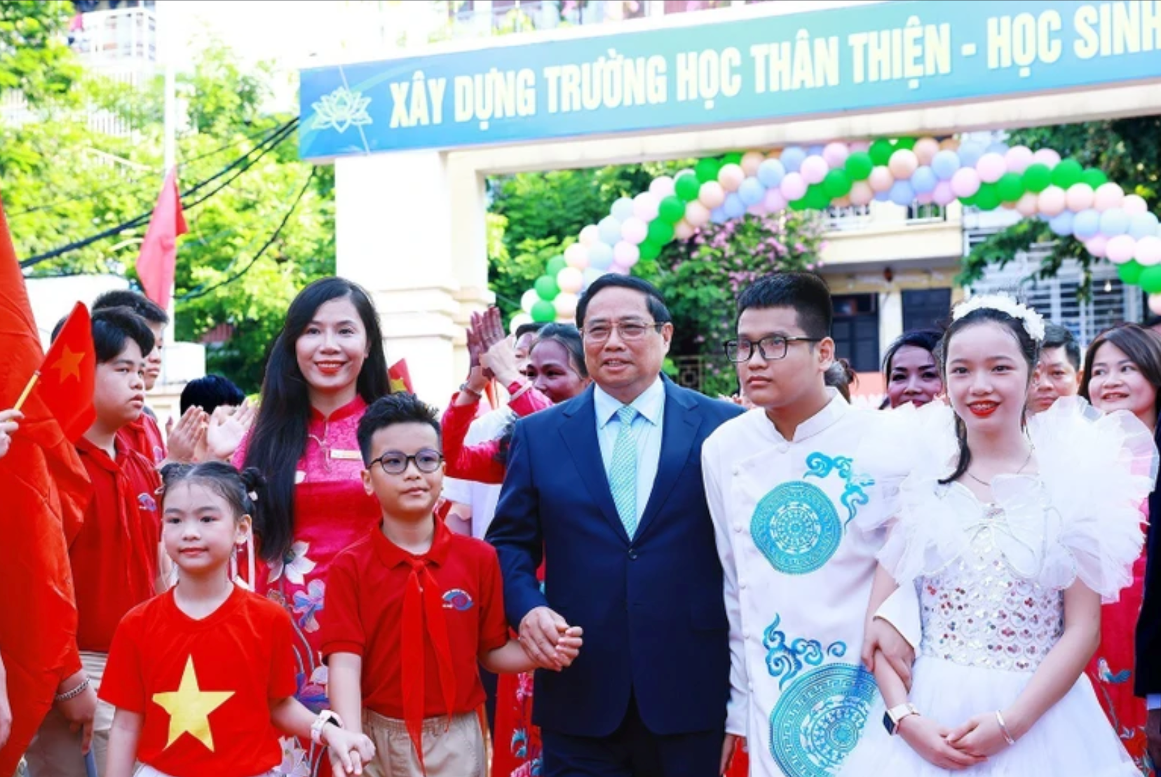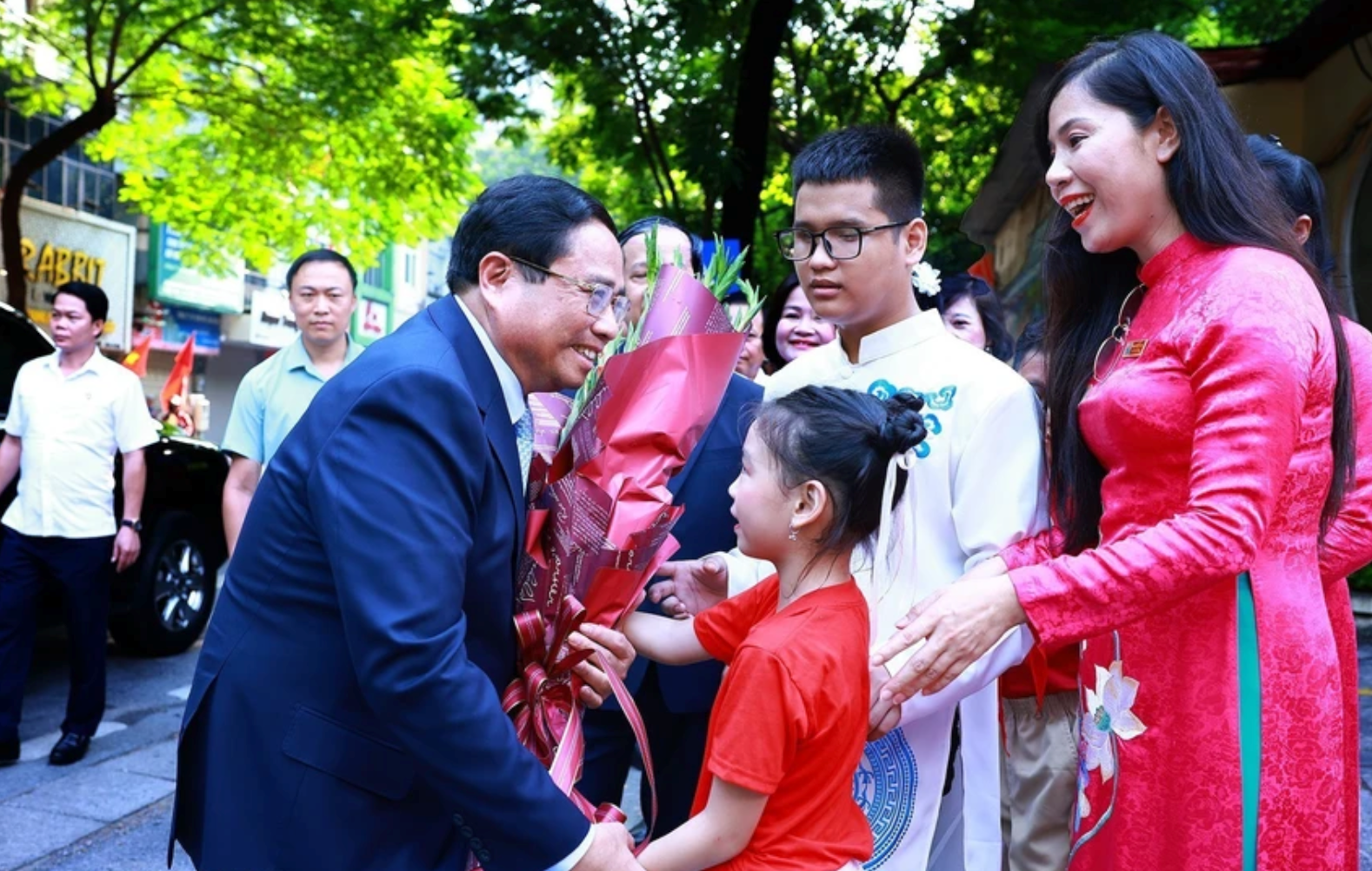 Học sinh trường Nguyễn Đình Chiểu tặng hoa, tiếp đón Thủ tướng Phạm Minh Chính. (Ảnh: TTXVN)
