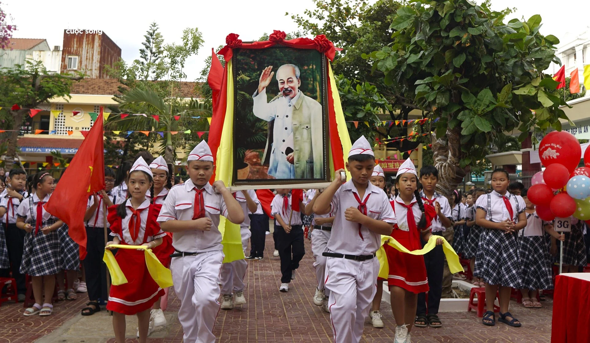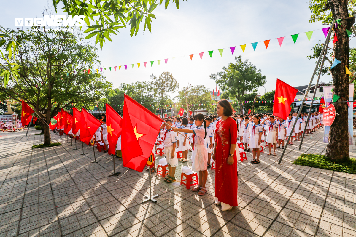 Nghi thức chào cờ khai giảng và rước ảnh Chủ tịch Hồ Chí Minh được các bạn nhỏ và thầy cô trường Tiểu học Ngô Mây (TP Quy Nhơn) thực hiện nghiêm trang.