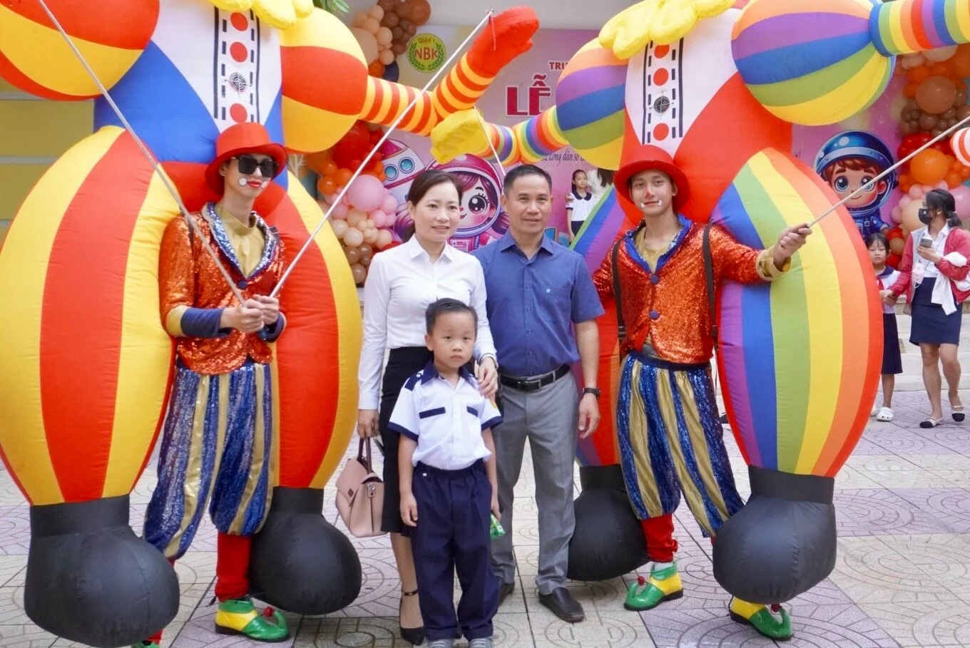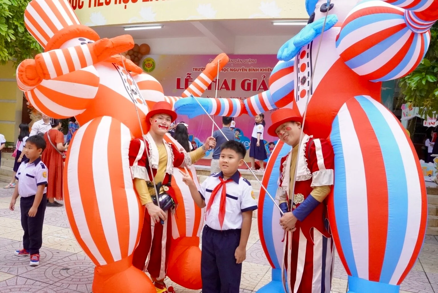 "Iron man" (siêu anh hùng hư cấu xuất hiện trong truyện, phim), robot và 4 chú hề khổng lồ xuất hiện trước cổng trường Tiểu học Nguyễn Bỉnh Khiêm (Quận 1) đón học sinh trong ngày khai giảng năm học khiến học sinh, phụ huynh thích thú.