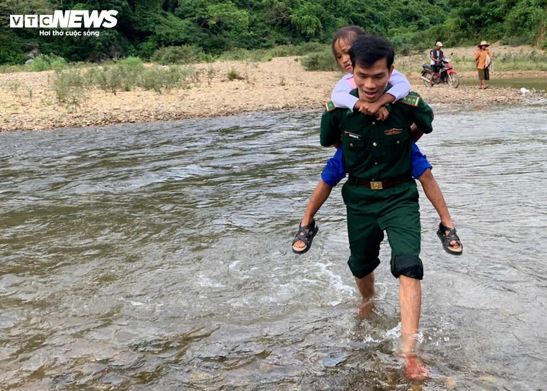 Bộ đội Biên phòng cõng học sinh băng suối dự khai giảng