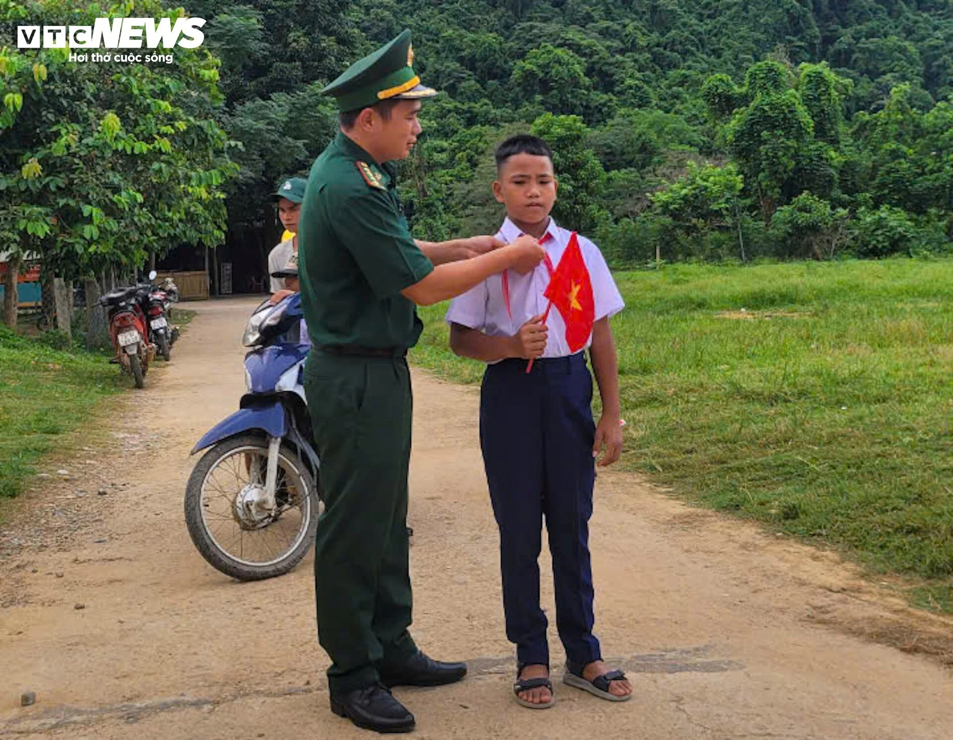 Thấu hiểu điều đó, lượng lượng thuộc Bộ Chỉ huy Bộ đội Biên phòng Quảng Trị bố trí lực lượng xuống tận các bản làng, điểm trường... để hướng dẫn, hỗ trợ các học sinh dự khai giảng. (Ảnh: Phan Vĩnh)